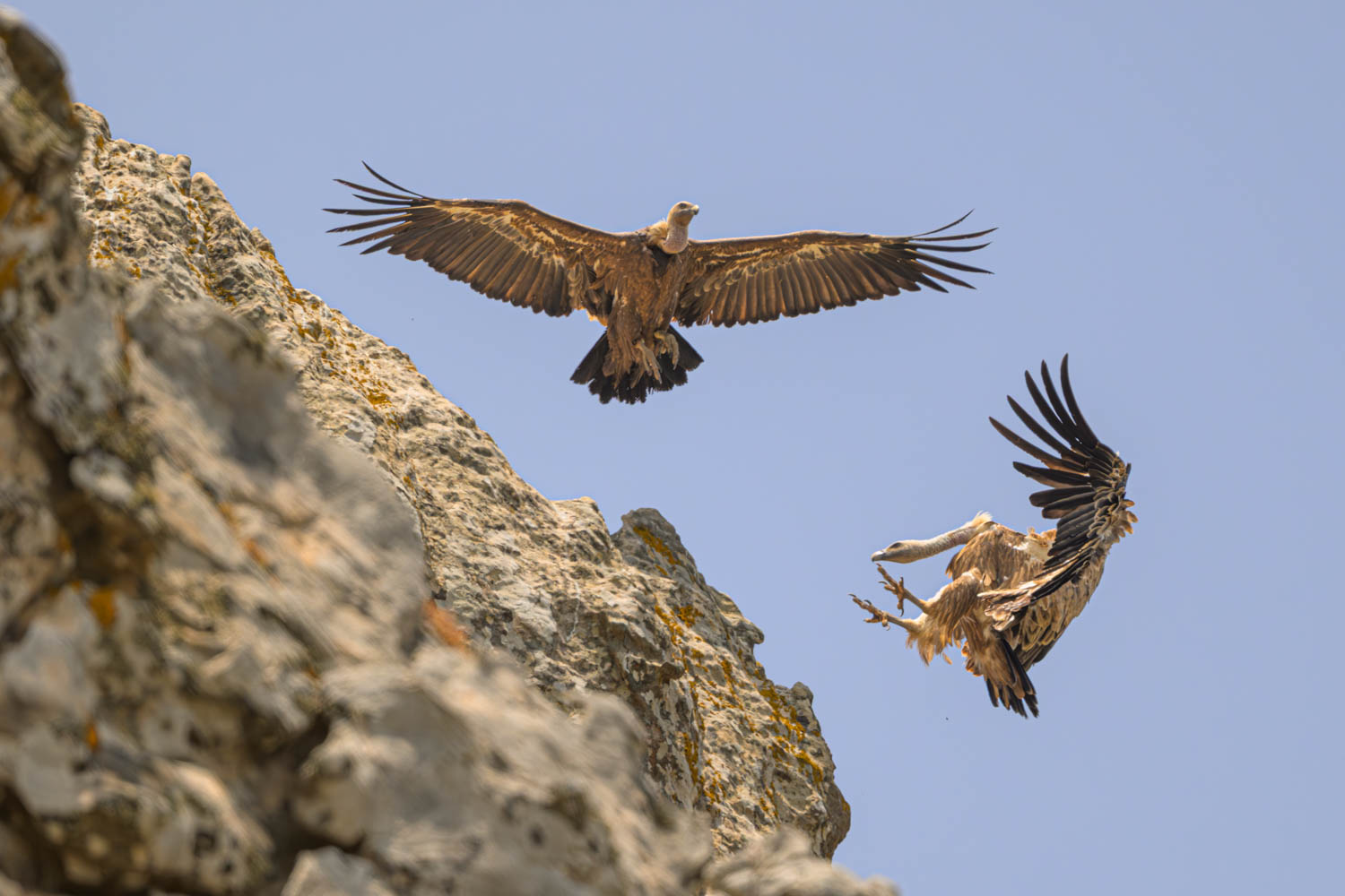 Einige Gänsegeier (Gyps fulvus) hatten in einer Felswand ihre Nester.