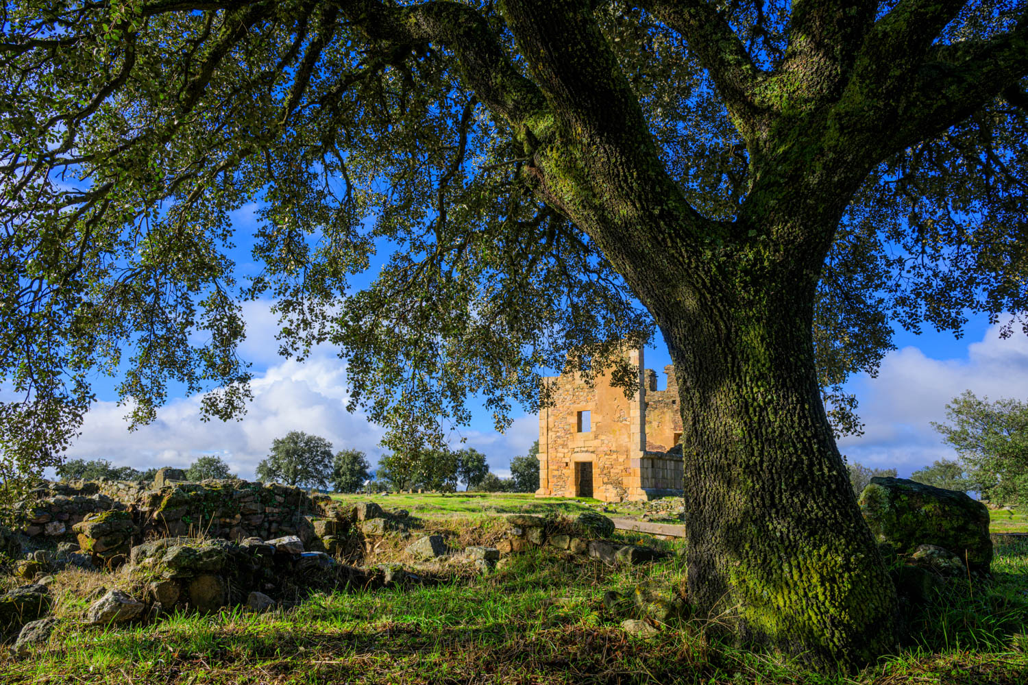 Bei Almofala steht zwischen alten Steineichen die Ruine eines Turmes, dessen Basis ursprünglich ein römischer Tempel war.