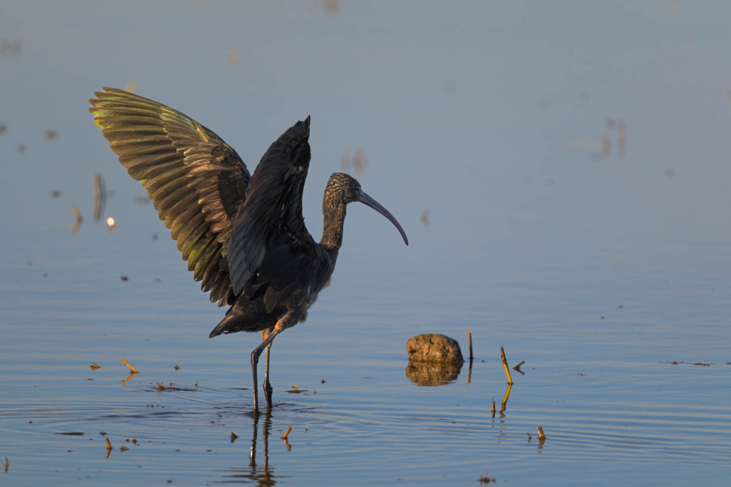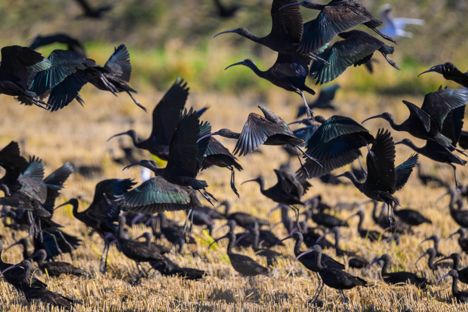 Die Reisernte war in vollem Gange. Die Ernte lockte Scharen von Vögeln an. Unzählige Ibise (Plegadis falcinellus) versammelten sich hinter dem Mähdrescher zu einem Festschmaus.