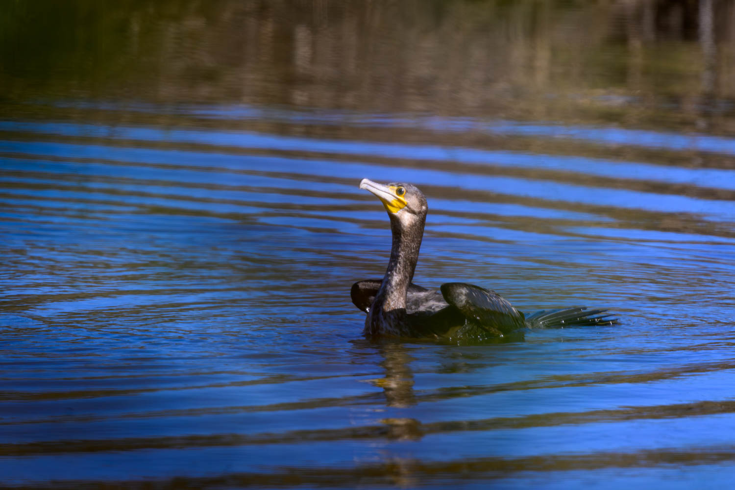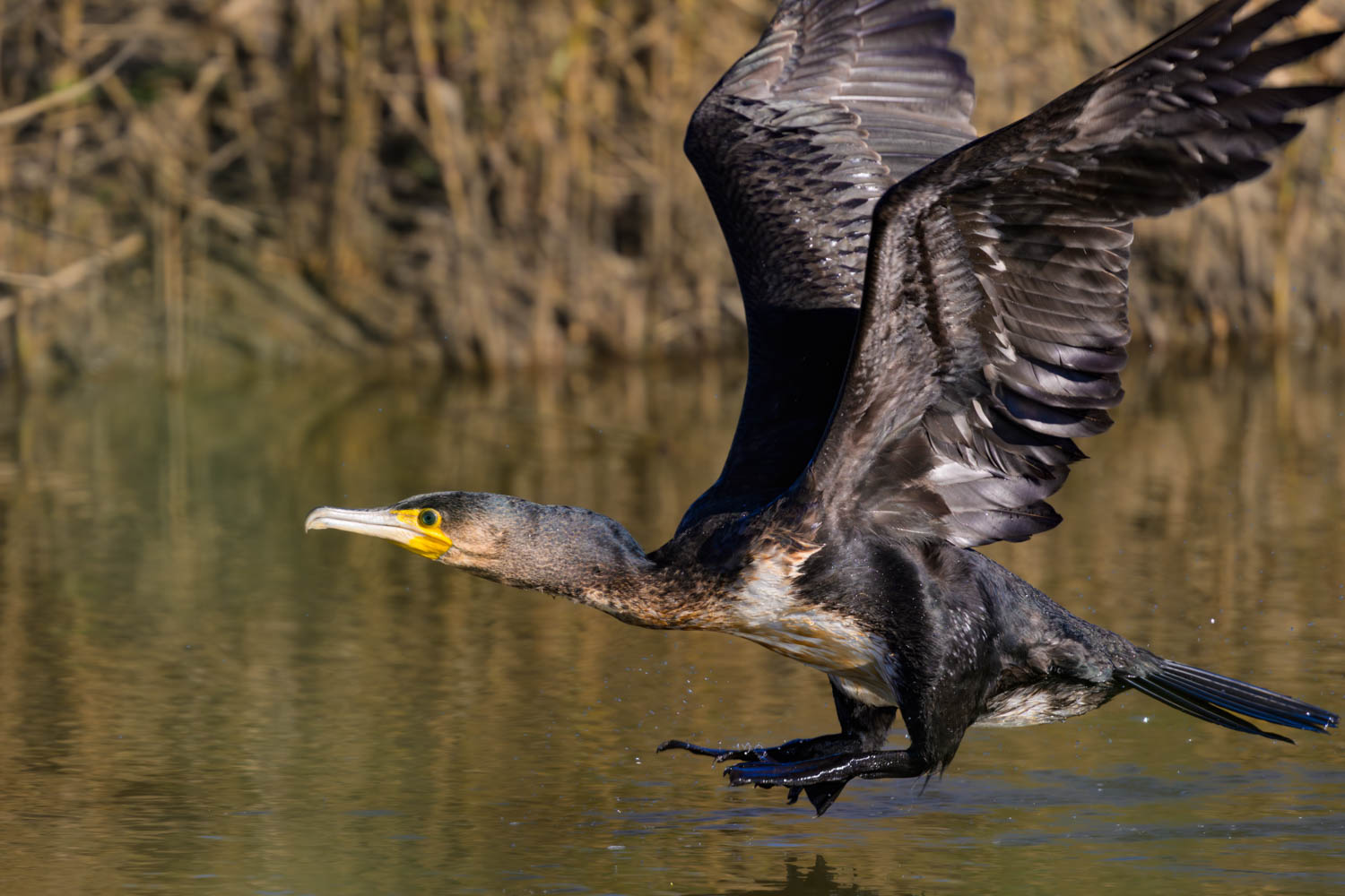 Ein Kormoran startete neben dem Weg aus dem Wasser.