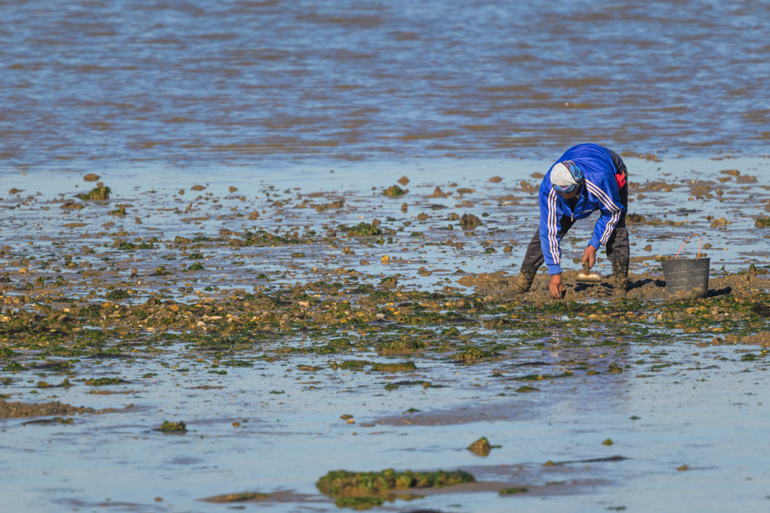 Bei den Salinas do Samouco übernachteten wir am Strand. Bei Ebbe kamen viele Muschelsammler ihrer Arbeit nach.