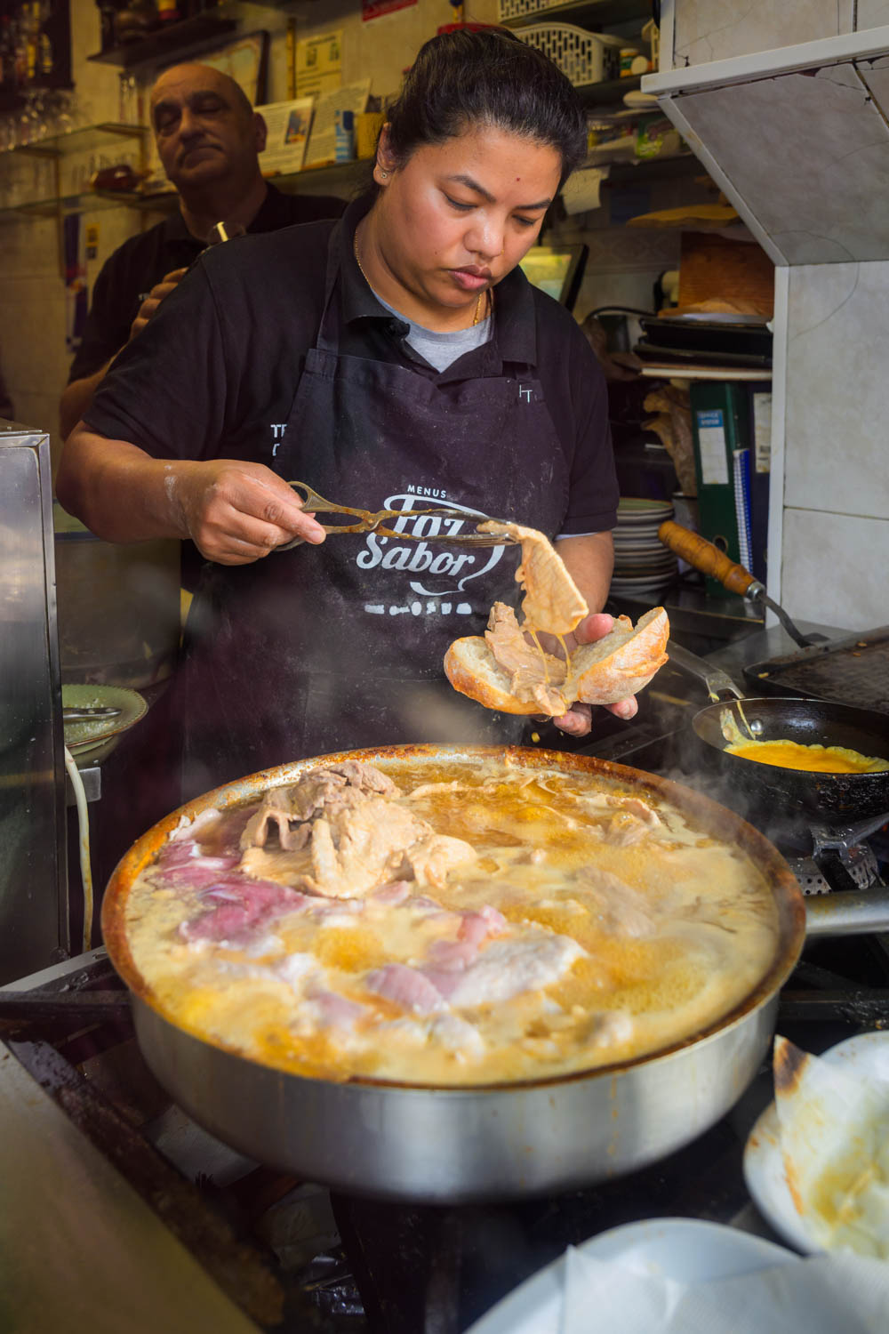 Gegenüber des Hintereinganges sahen wir eine Schlange vor einer kleinen Imbissbude. Hier gab es Bifanas, traditionelle Schweinefleisch-Sandwiches.