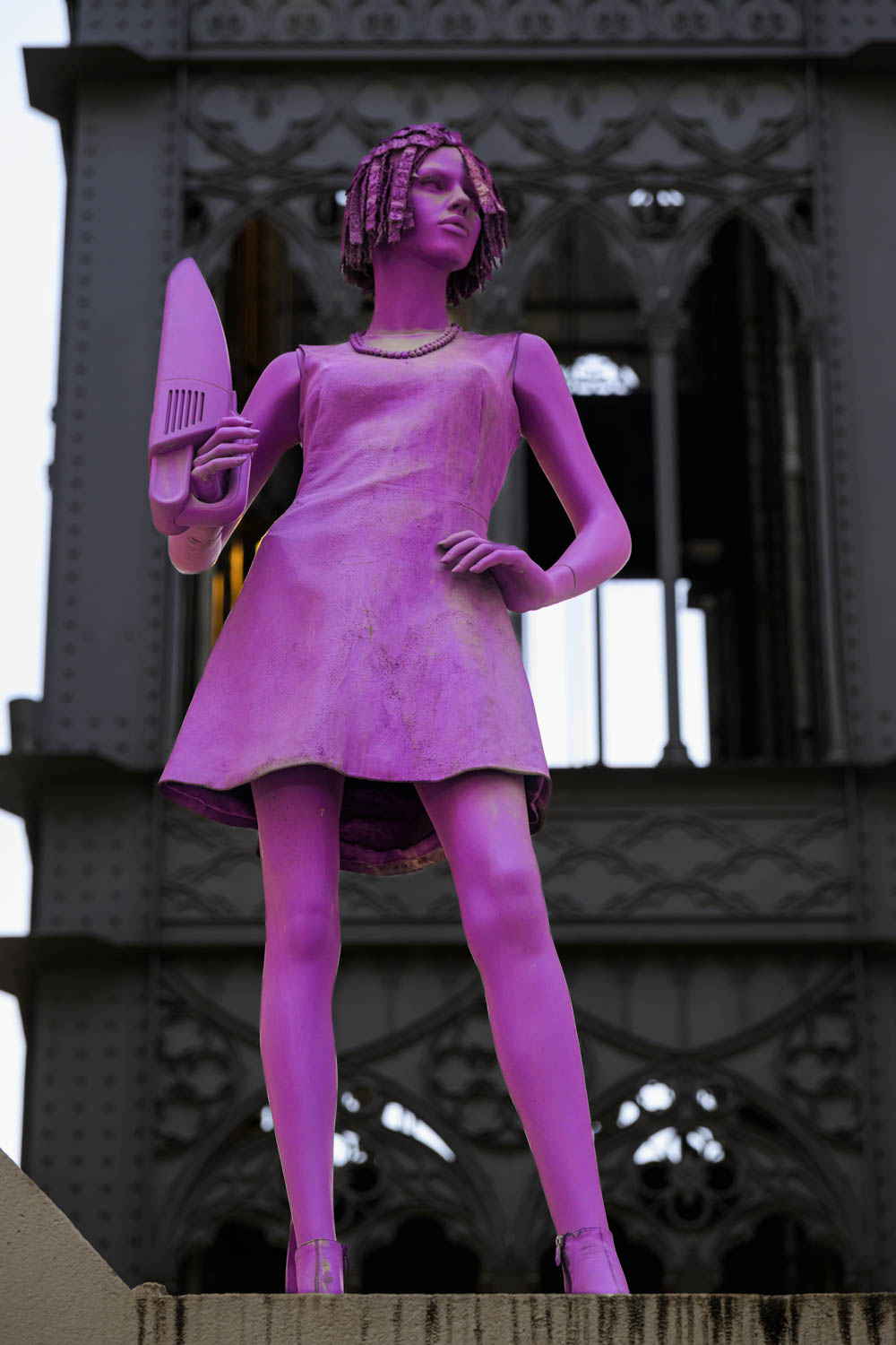 Vor dem Aufzug steht eine rosa Dame mit Staubsauger: „Sofia“ von Superlinox. Die monochromen Figuren des Inkognito-Künstlers tauchen stets unverhofft an den unterschiedlichsten Stellen auf.