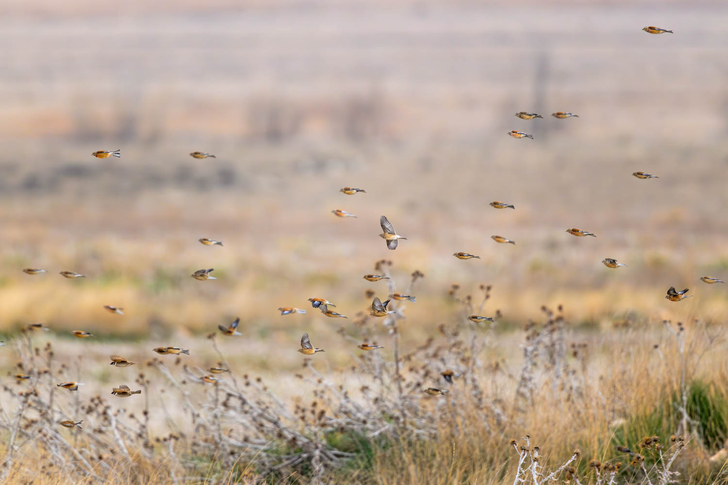 Um Sol herum flog eine Schar Bluthänflinge (Linaria cannabina).