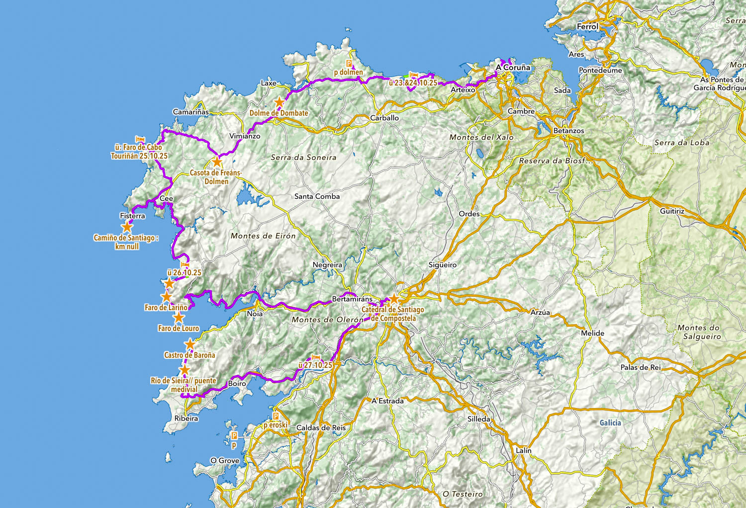 Wir posierten am Kilometer 0 des Jakobsweges. Schon für die Kelten war hier das Ende der Welt. Hinter dem Horizont kamen nur noch die Inseln, die den Toten Aufenthalt boten.