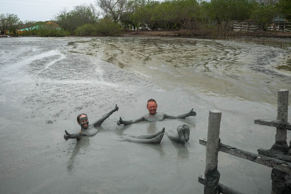 Wir hatten dann den ganzen Schlamm für uns alleine. Mit ziemlichen Kraftaufwand schafften wir es bis zum Zentrum des Kraters, wo kleine Eruptionen aufsteigen. Die Konsistenz und Dichte ist der des Lodo del Totuma (letztes Foto Blog 99) ähnlich. Uns hat es aber hier besser gefallen und unsere Haut hat sich danach wieder super angefühlt.