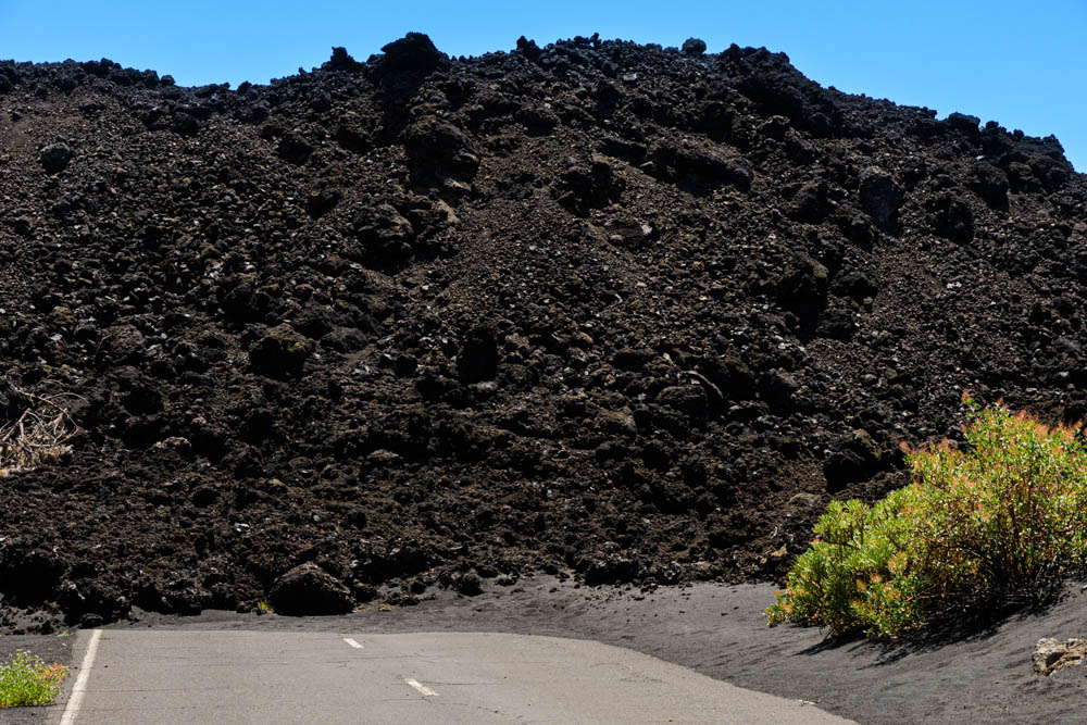 Wenige Meter hinter dem Zaun sieht man den Grund der Sperrung: 2021 schob sich die Lava quer über die Straße.