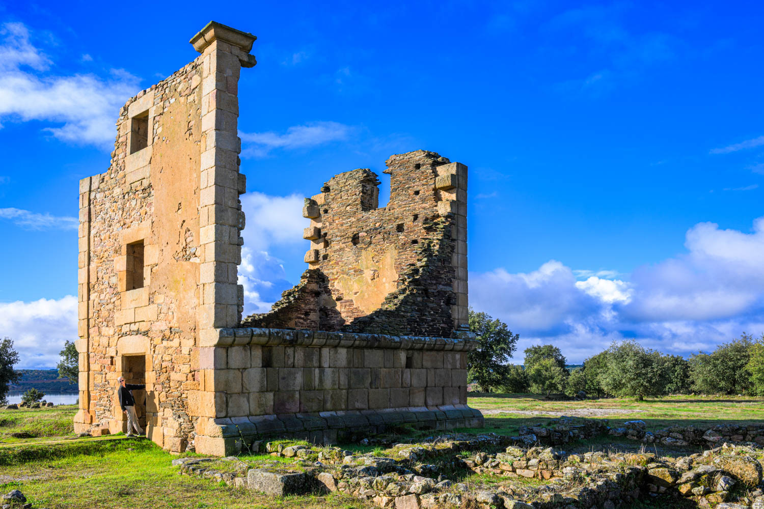 Bei Almofala steht zwischen alten Steineichen die Ruine eines Turmes, dessen Basis ursprünglich ein römischer Tempel war.