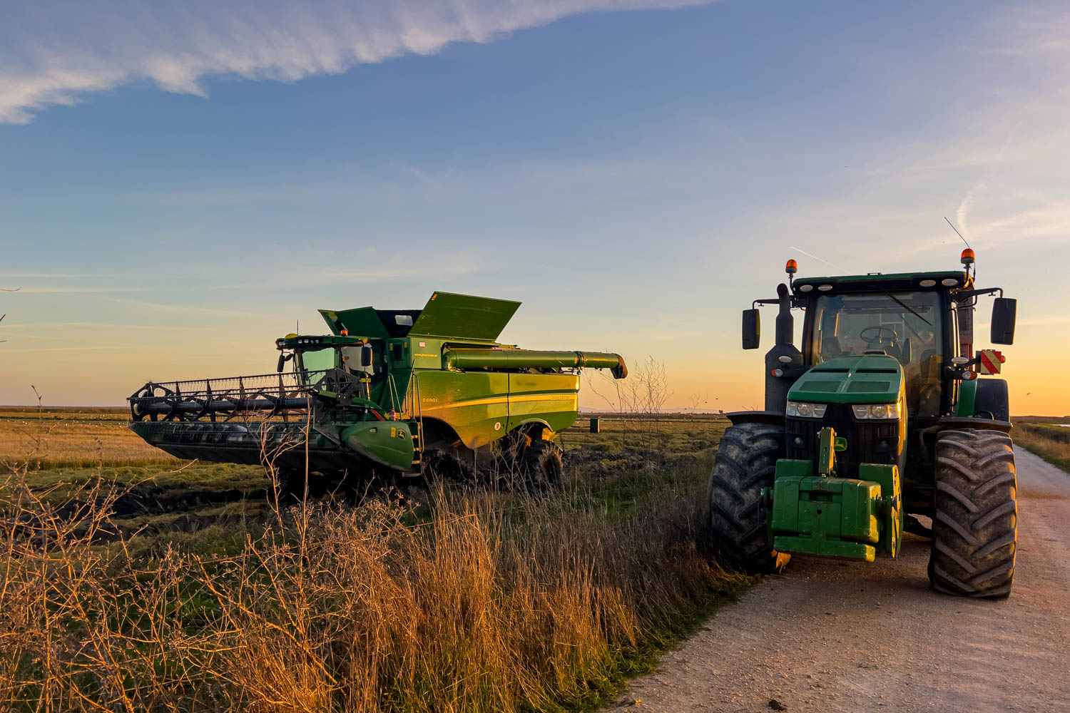 Die Reisernte war in vollem Gange. Die Ernte lockte Scharen von Vögeln an. Unzählige Ibise (Plegadis falcinellus) versammelten sich hinter dem Mähdrescher zu einem Festschmaus.