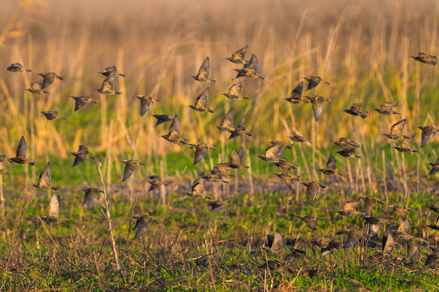 Stare (Sturnus vulgaris) flitzten in Schwärmen umher.
