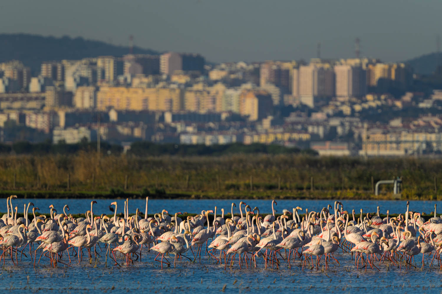 Die abgeernteten Felder wurden geflutet. Dies lockte eine große rosa Wolke an: Rosaflamingos (Phoenicopterus roseus).