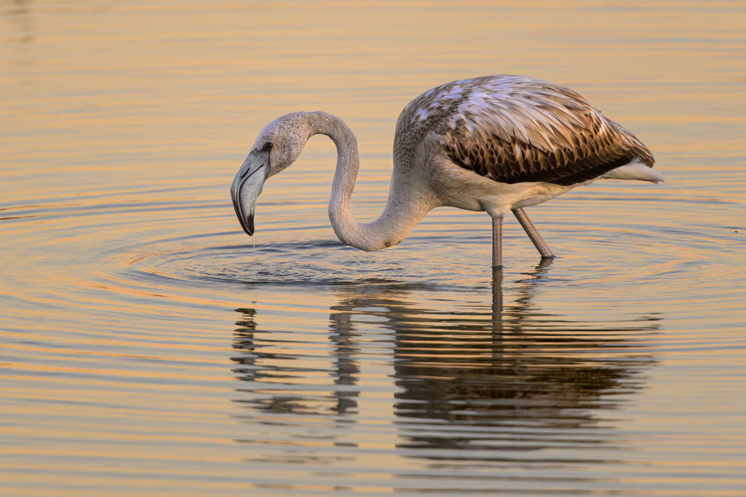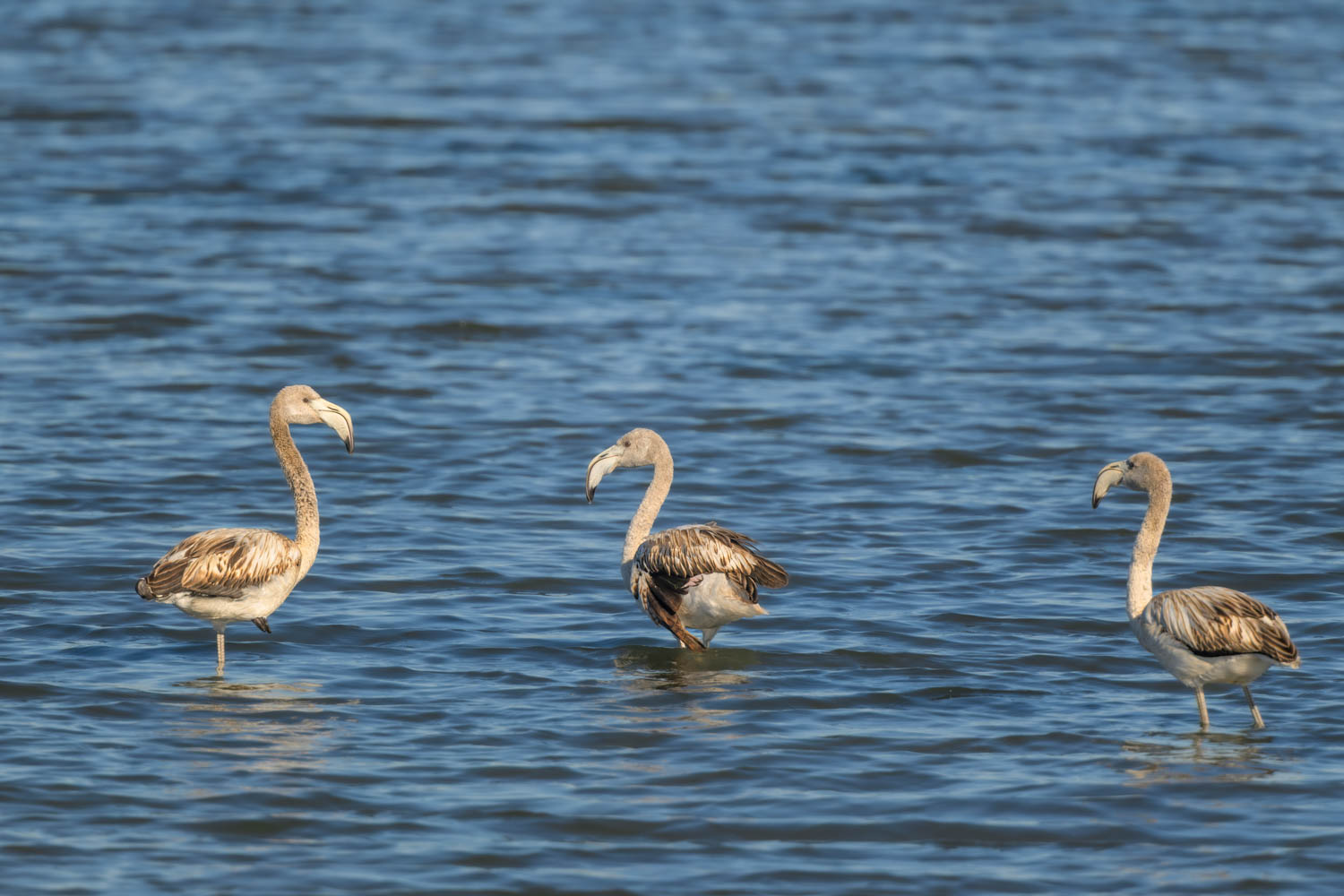 Ein paar junge Rosaflamingos (Phoenicopterus roseus) ließen sich gerne fotografieren. Wie üblich, waren sie nicht so scheu wie die adulten Tiere.