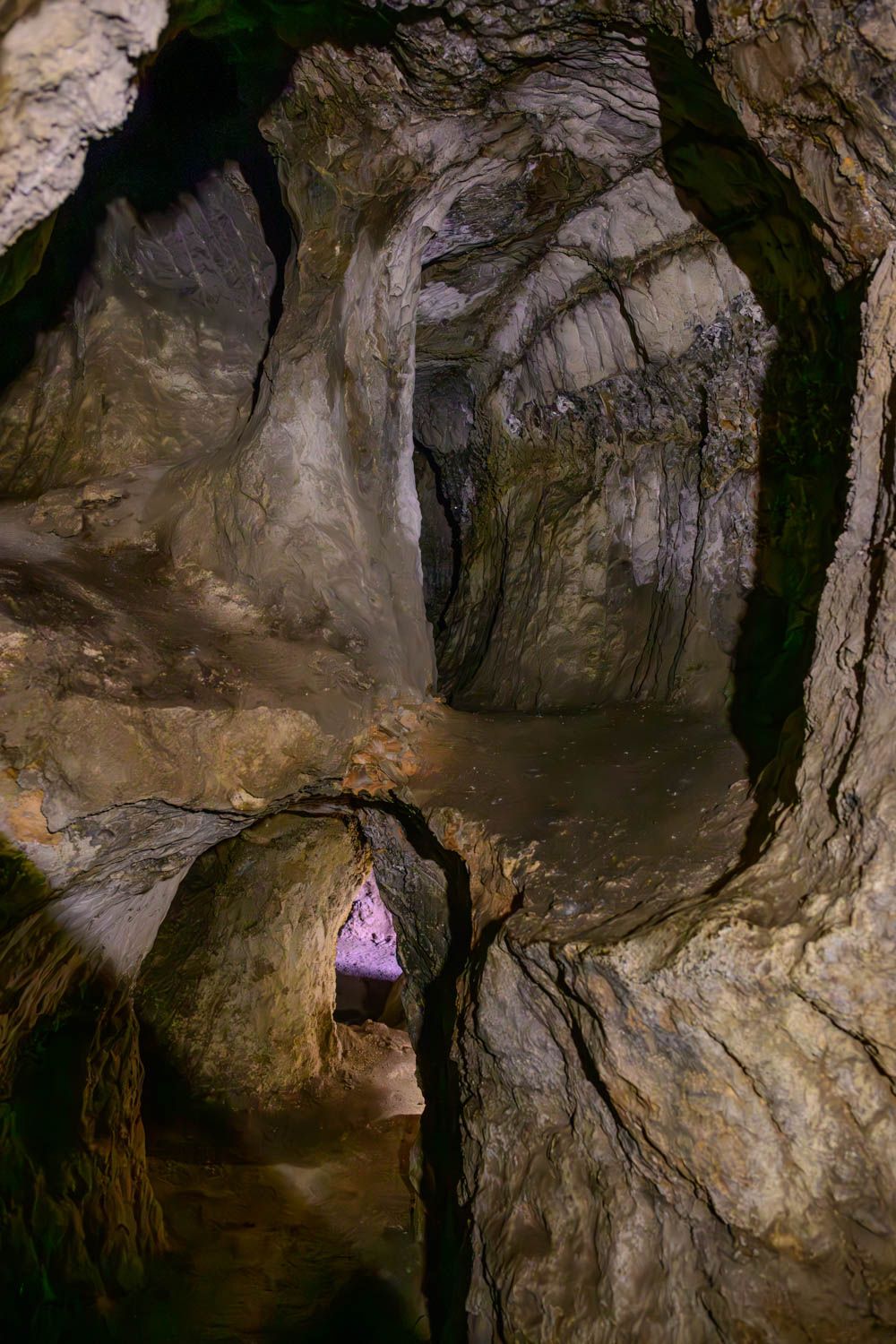 Am Grund der Erdspalte schuf ein kleiner Wasserfall im Lauf der Zeit ein abstraktes Kunstwerk.