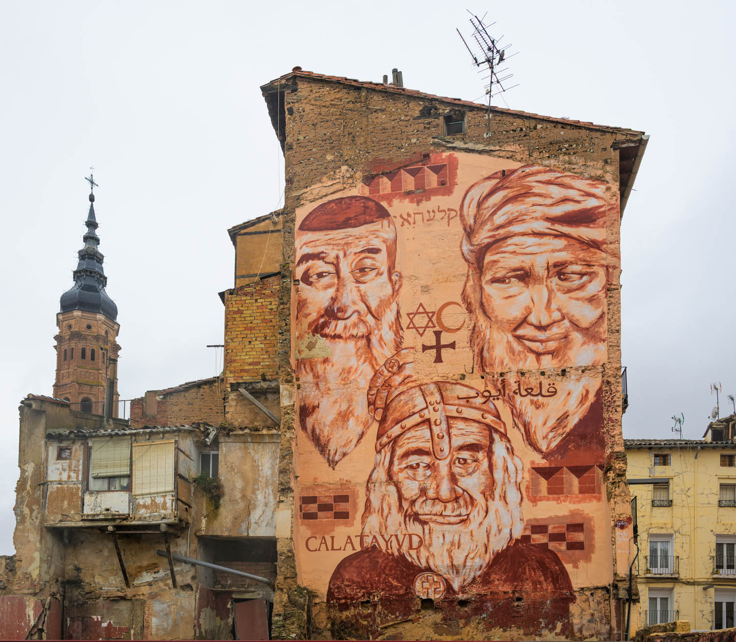 Ein großes Mural erinnert an die drei Religionen, die die Stadt prägten.