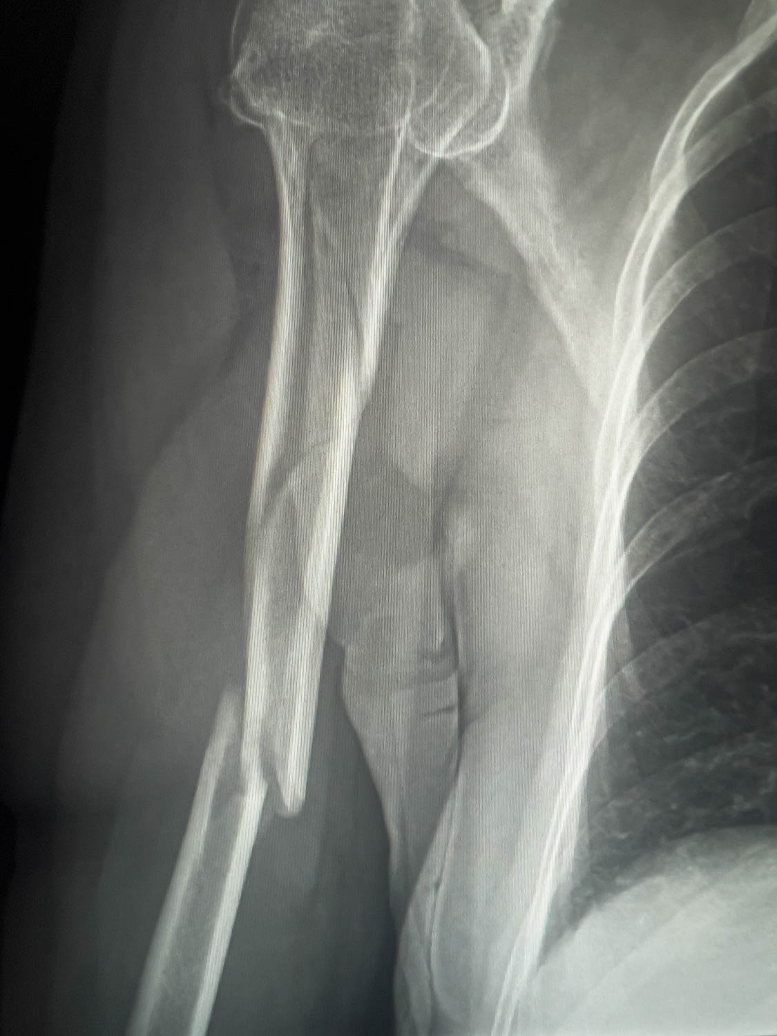 So passierte es dann: Ulrike rutschte aus und krachte mit dem rechten Oberarm an einen Pfosten. Das war zu viel für den Oberarmknochen und er zerbrach in mehrere Stücke.