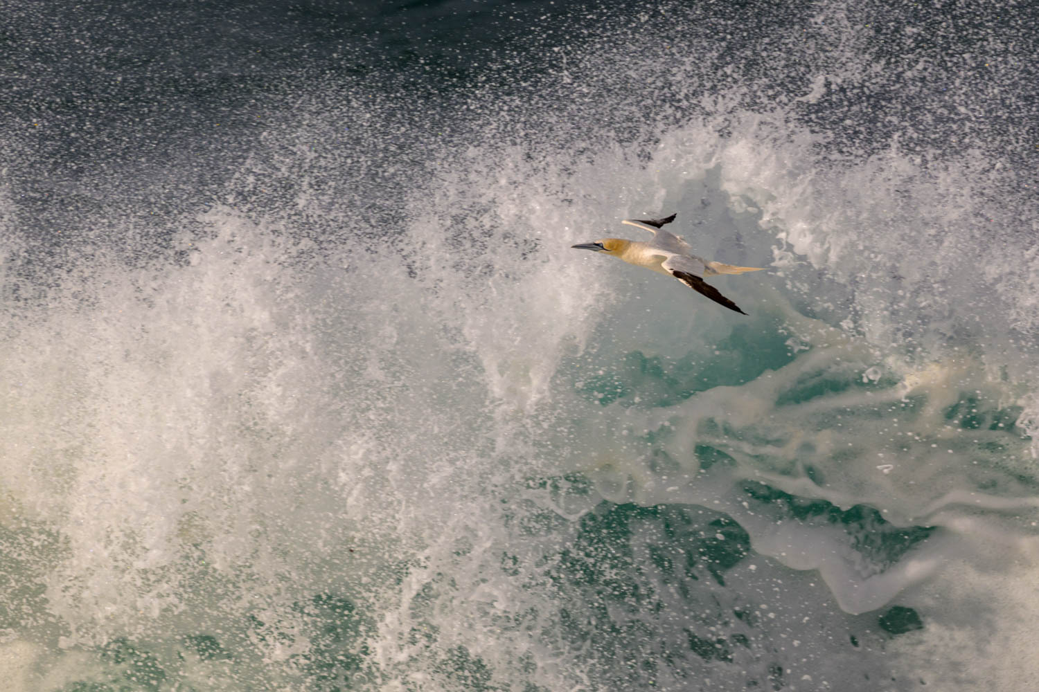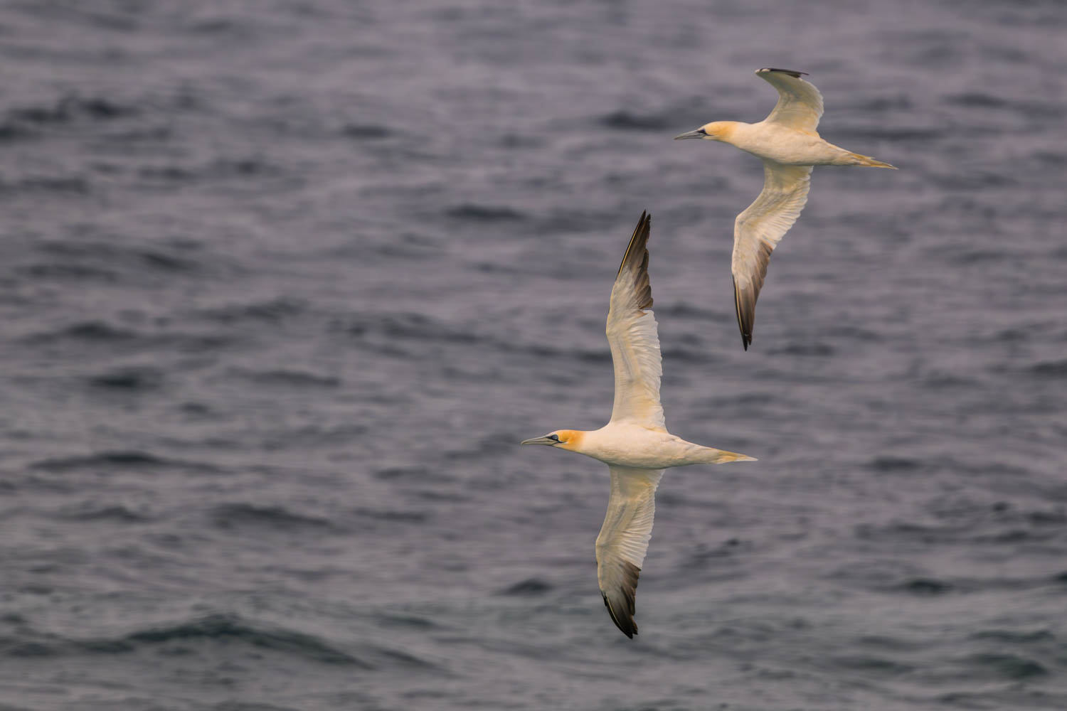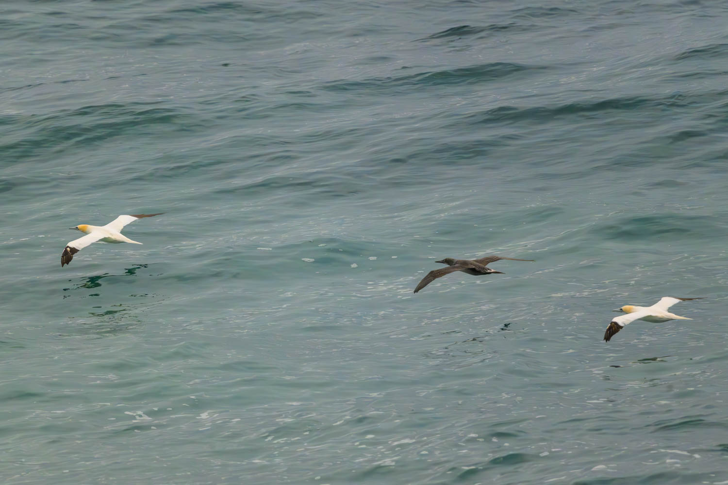 Es waren Basstölpel (Morus bassanus). Einige zogen so nahe an uns vorbei, dass wir sie gut fotografieren konnten.