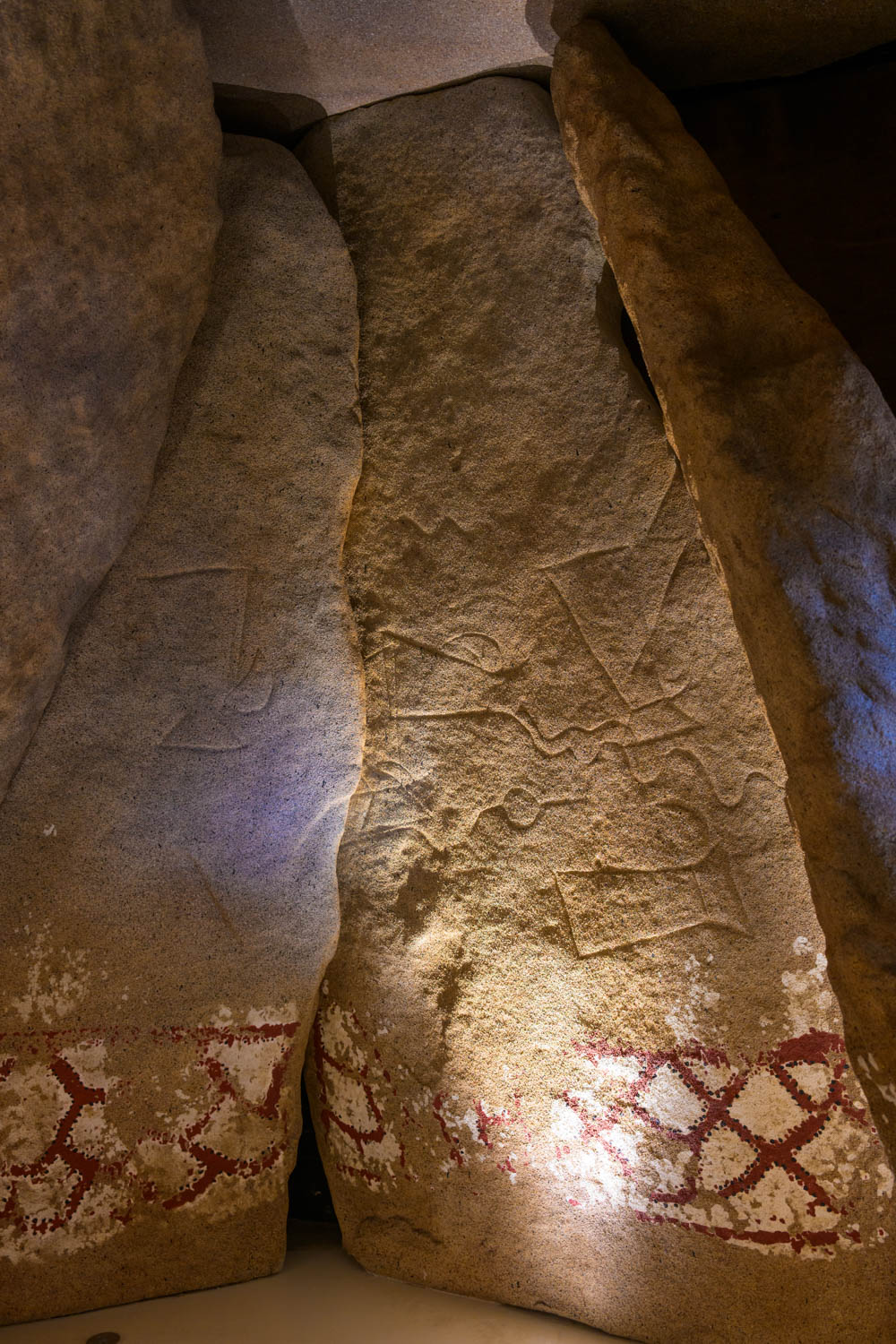 Sein Inneres ist bemalt und mit Felsritzungen versehen. Im kleinen Museum der Ausgrabungsstätte konnten wir eine Nachbildung bewundern.