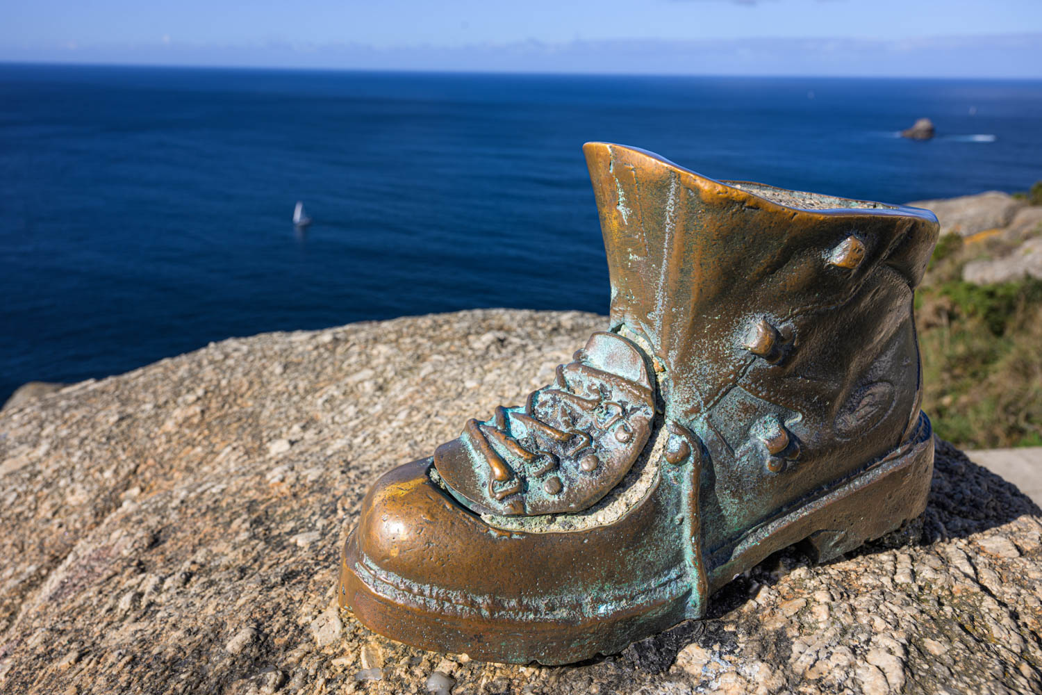 Dem Schuh eines Pilgers wurde ein Denkmal gesetzt. Hier am Ende des Weges lassen viele ihre Schuhe zurück, mit denen sie gepilgert sind.