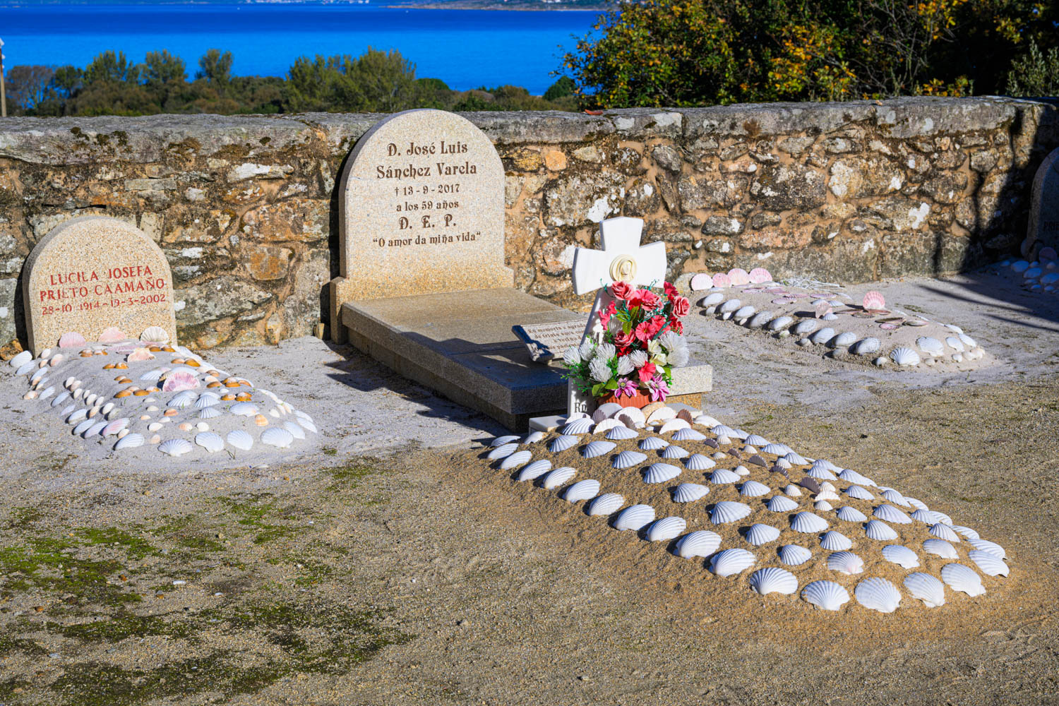 Am Friedhof von Lira sind einige Gräber mit Jakobsmuscheln geschmückt.