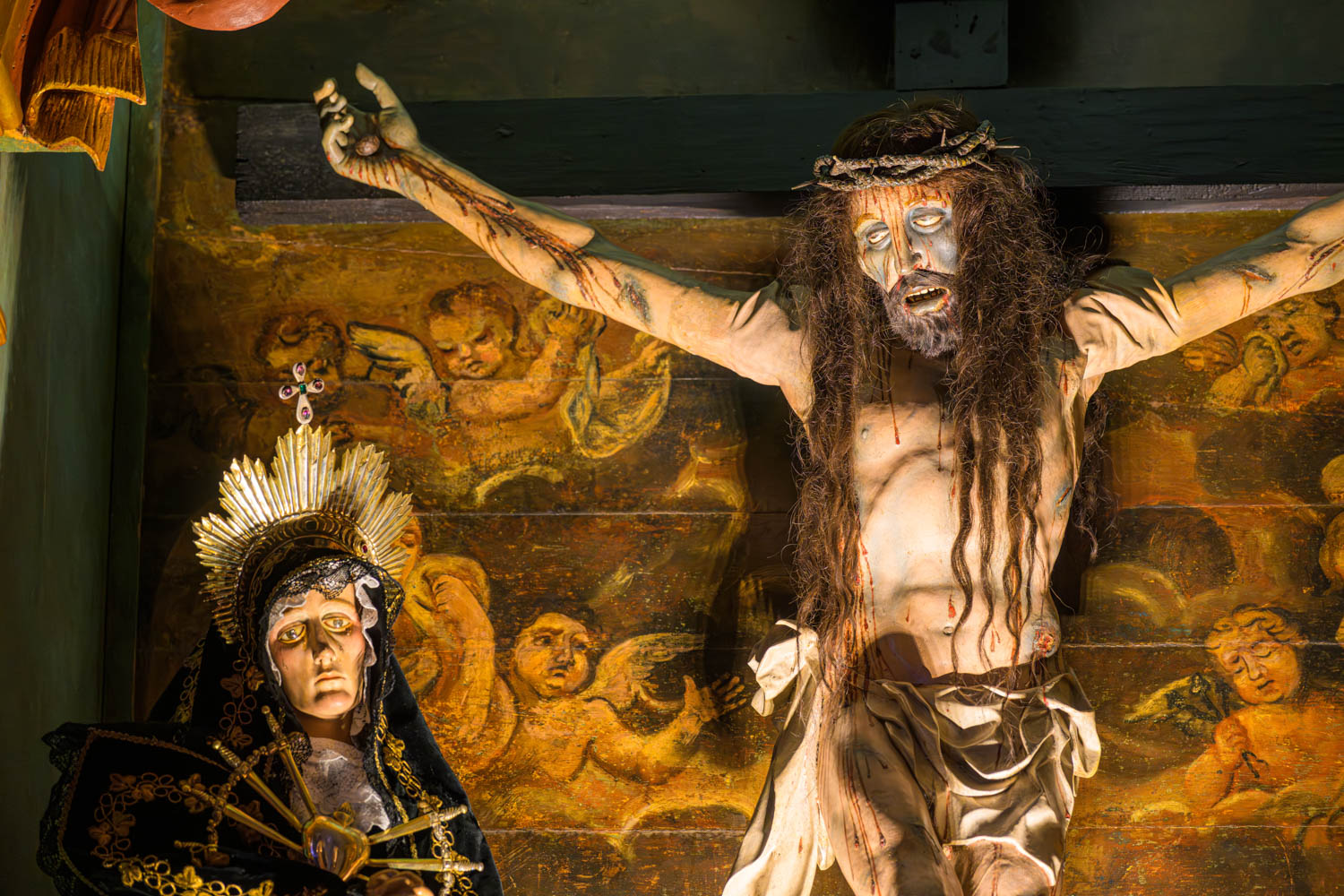 Die Darstellung des gekreuzigten Christus ist sehr drastisch.