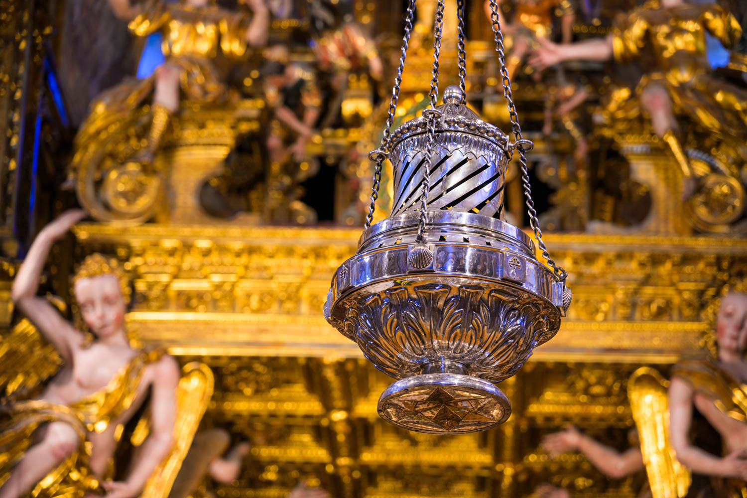 Vor dem Altar hängt ein enormer Weihrauchschwenker von der Decke.